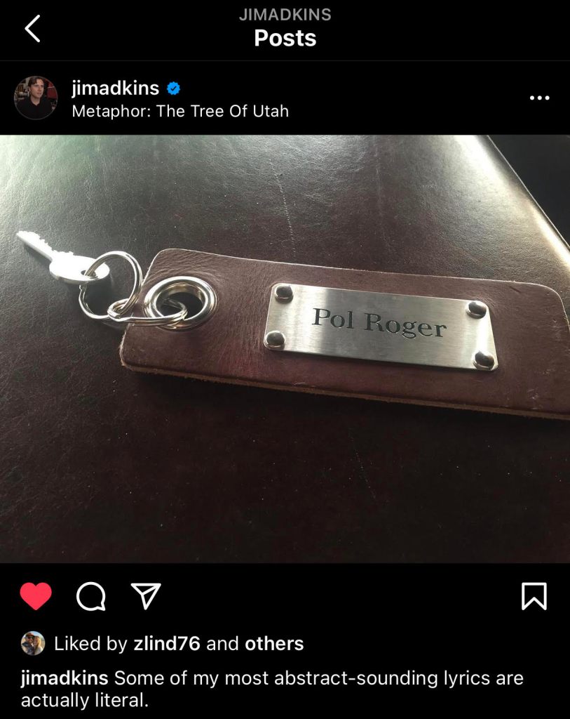 In the caption of the Instagram post, Jim explains this is literal. Obviously, it’s supported by the picture. From what I’ve since read about this Pol Roger key, it’s from a Scottish hotel that he or the band as a whole was staying at while on a tour. The hotel is famous for its rooms all being named after different types of champagne and liquor. Someone can correct me if I’m wrong, I don’t know the name of the hotel to verify this myself.
