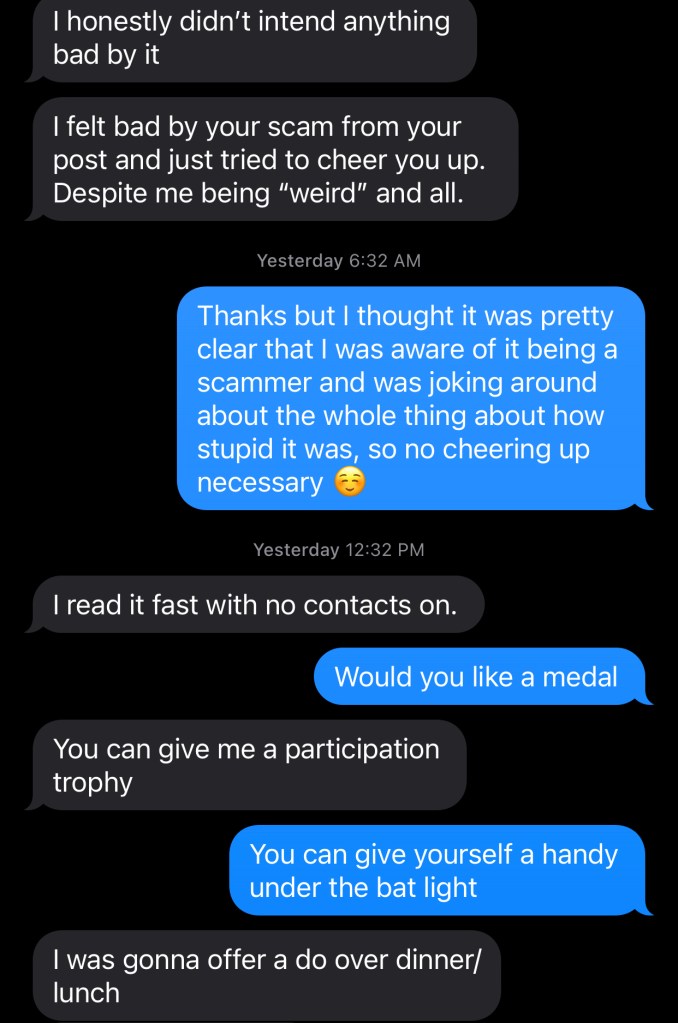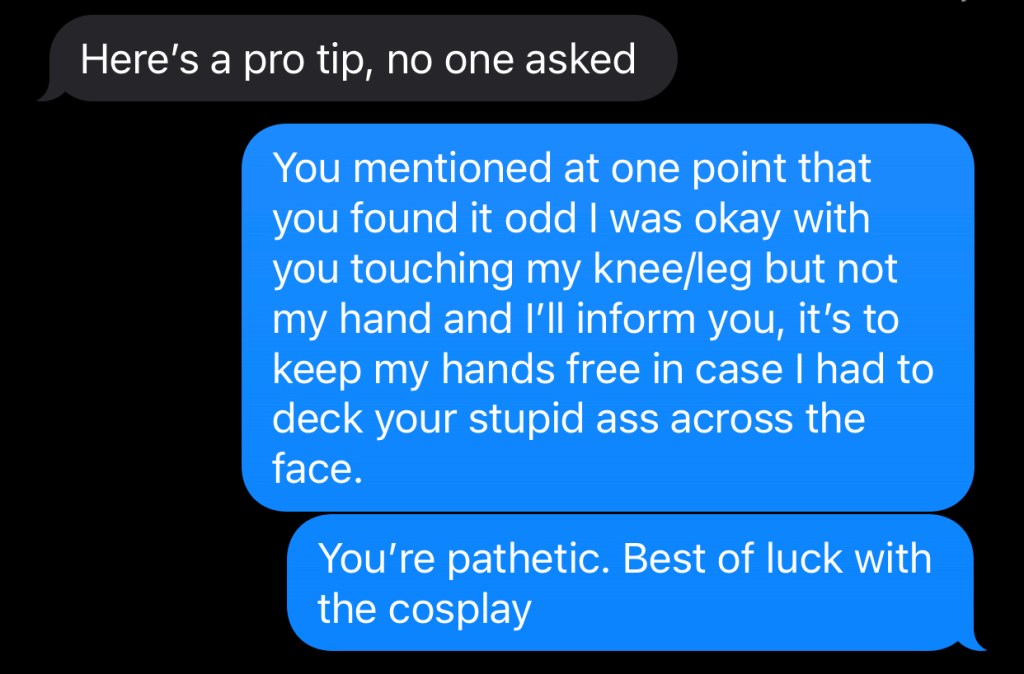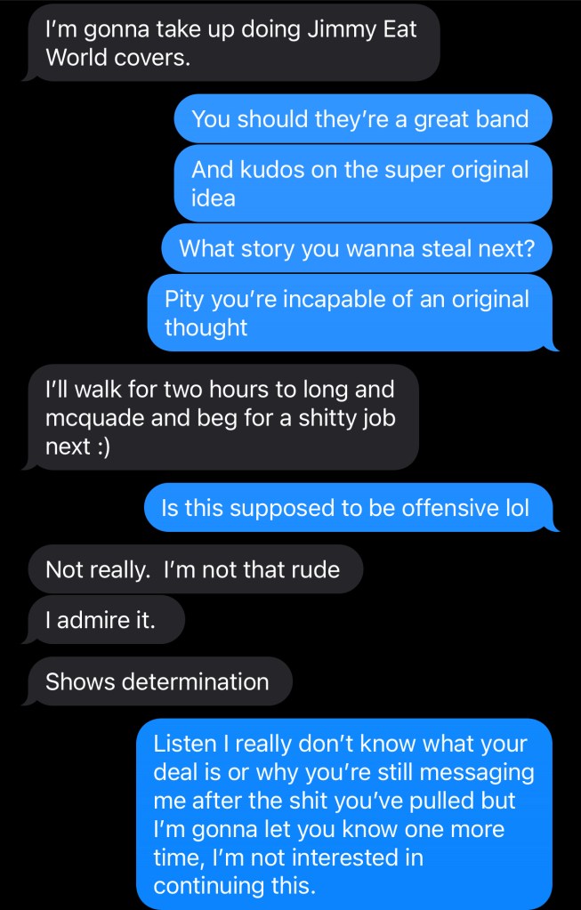 I also know at this point in these text messages that this guy is just trying to keep this conversation going, and probably just to piss me off for whatever sad reason he’s concocted for himself.