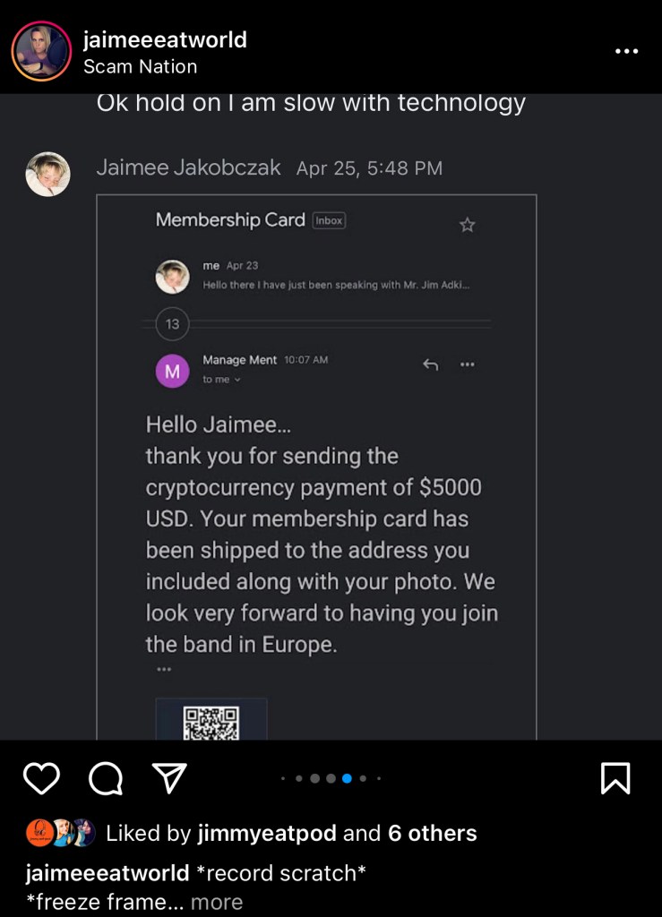 In short this IG post is a joke post but it’s also a very well meaning PSA for fans of bands to be weary of scammers who impersonate their favourite artists, slide into their dm’s, and then try to get money out of them. I wasn’t even scammed, I just messed with the scammer right back because sometimes I like to learn their tactics. Not for personal use, but literally for a post just like this because it is actually so easy nowadays to fall victim to scammers. Not this one in particular given the ridiculous nature of the whole thing, but generally, especially for the elderly or those that are not as familiar with the internet and all the fun ways you can manipulate texts and images, like the one that starts off this multi-photo post with an old photo of Jim holding a sign he clearly didn’t write himself.