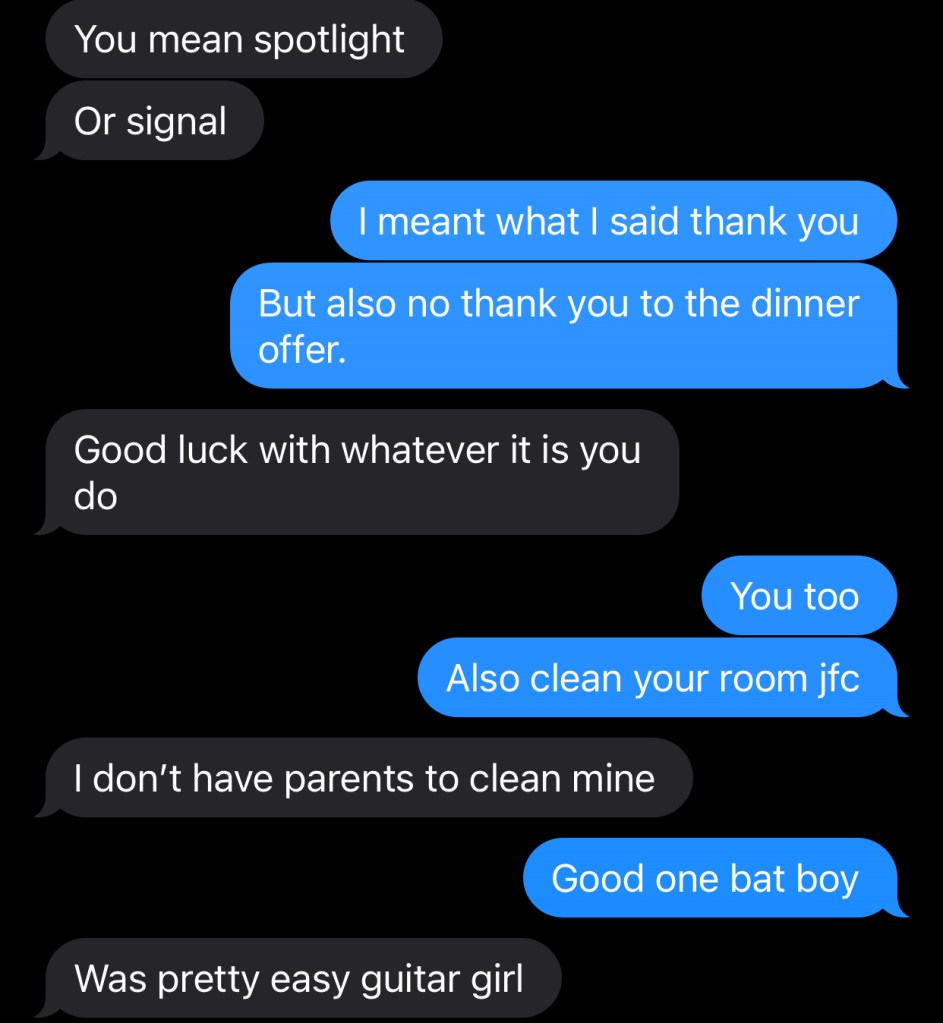 He’d message me randomly just to say I’m pretty or that he liked watching me play guitar, which, is nice at first don’t get me wrong, but then he’d repeat himself again and again without us having any sort of other conversation at the time. Maybe it sounds petty to say but it starts to feel manipulative and bombarding. Like at a certain point I simply don’t know how to respond to 8 messages almost in a row where you are repeating the same words. Let’s talk about movies!
