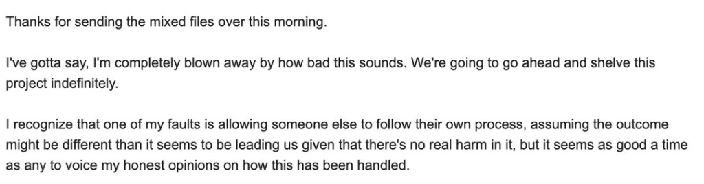 He didn’t seem to care about the project. I could do better work at my home studio myself. This took entirely too long to end up with this result. That I hoped he didn’t treat all his clients projects this way because it feels like a racket. That I felt he underpaid for session work which is a shame given his position in the industry. That this entire experience has been a very expensive lesson and a complete waste of my time. And that I under no circumstance give him permission to release it.
