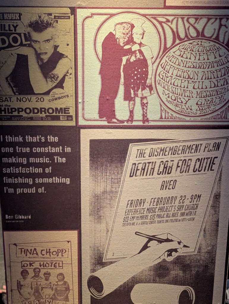 It was the second mention I caught in the museum of Death Cab For Cutie (who are also a little blip on the Seattle-area map I told you about in the Nirvana room representing Bellingham) and I was happy to see it. When I was in Seattle, the grunge-presence was obviously quite noticeable; tons of shops with artwork or merchandise relating to Pearl Jam, Nirvana & on and on, but not much of Death Cab For Cutie. I’d quip to myself that it was because they’re not dead yet and that it’s a bit of a bummer how we often wait until people pass away to truly acknowledge their cultural significance and impact. I love a lot of Seattle-based bands (even before I knew they were from there!) but the only one that had a strong enough grasp on me personally to bring me there is Death Cab.