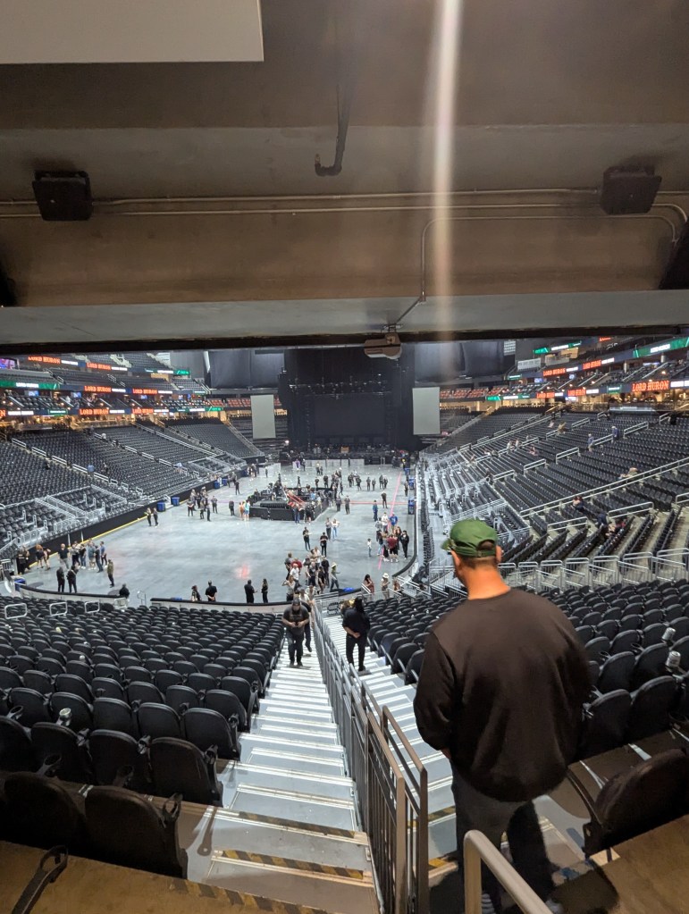 Once we got our wristbands we were off. It was a bit of a trek to get through the arena down to the floor, fortunately I had a hoard of people to follow. Because of the entry kerfuffle, I was condemned again to my usual spot: second row, little to the left and fortunately behind some women who were shorter than me. Sight lines are of critical importance on the floor.